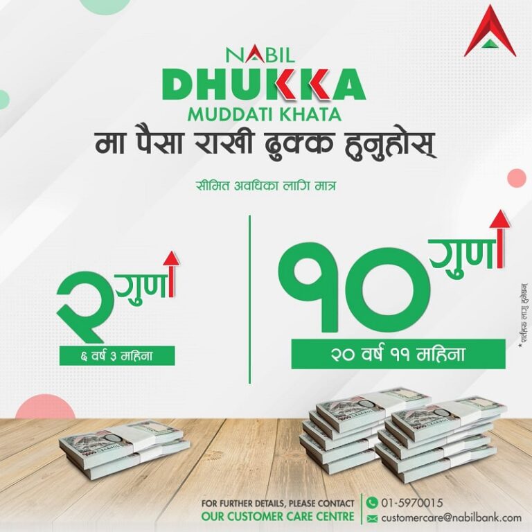 “नबिल ढुक्क मुद्धती खाता” अन्तर्गत ग्राहक वर्गले मुद्धतीमा जम्मा गरेको रकम तोकिएको समय पश्चात् दोब्बर देखि दश गुणा सम्म रकम प्राप्त गर्न सक्नेछन् ।