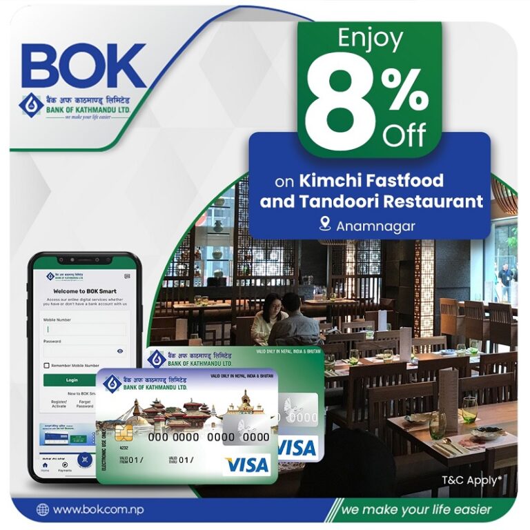 बैंक अफ काठमाण्डूका ग्राहकलाई किम्ची फास्टफुड एण्ड तन्दुरी रेस्टुरेन्टमा छुट