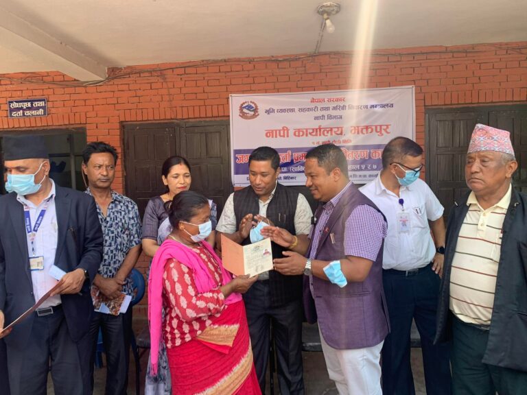जग्गा नापजाँच ऐन २०१९ को दफा ६(५) बमोजिम नाप जाँच भई तयार भएका जग्गाधनी पुर्जा वितरण गरिएको नापी कार्यालय भक्तपुरका प्रमुख मग्नु दत्तले बताए । उनले २०२१ सालमा प्राविधिक कारणले नापजाँच हुन नसकेको र परापुर्व कालदेखी हकभोग गरी बसोबास गरिरहेको जग्गालाई स्वबासी जग्गाको रुपमा परिभाषा गरिएको बताए ।