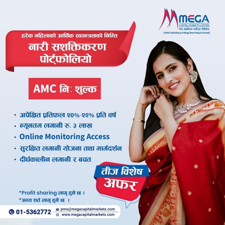काठमाडौं, १३ भदौ । मेगा क्यापिटलले तीजको अवसरमा नारी सशक्तिकरणका पोर्टफोलियो सेवामा छुट दिने भएको छ । यो छुटबाट नारीहरुले आत्मनिर्भरताका लागि शेयर बजारमा लगानी गरी आफ्नो भविष्य सुनिश्चित गर्न टेवा पु¥याउने विश्वास कम्पनीले लिएको छ ।