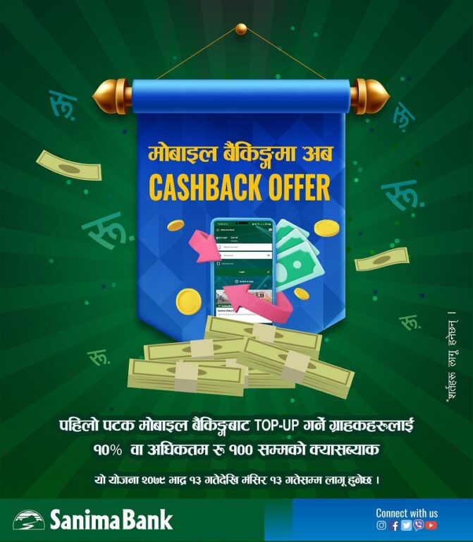 उक्त योजना अन्तर्गत, सानिमा मोबाइल बैंकिङ्गबाट पहिलो पटक Top-up गर्नुहुने ग्राहकहरुले १० प्रतिशत वा अधिकतम रु.१०० सम्मको क्यासब्याक प्राप्त गर्र्न सक्नेछन् । यसैगरी मोबाइल बैंकिङ्ग प्रयोगकर्ताहरु मध्ये सबै भन्दा बढी कारोबार गर्ने ३ जना ग्राहकहरुले मोबाइल फोन जित्न सक्नेछन् ।