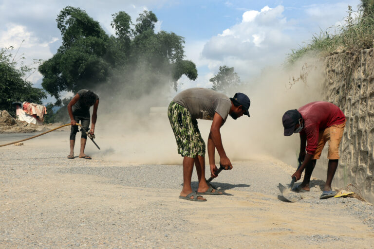 ‘काठमाडौँ,२४ भदौ । गल्छी–त्रिशूली–मैलुङ–स्याफ्रुवेशी–रसुवागढी सडक योजना’ मार्फत निर्माण भइरहेको नुवाकोटको बेलकोटगढी–८ स्थित जिलिङ क्षेत्रमा सडक कालोपत्रे गर्न धुलो हटाउदै मजदुर । अन्तरराष्ट्रिय नाका रसुवागढी जोड्न उक्त योजनाको ८३ किमि सडक निर्माणमध्ये ६ वर्षमा ५५ प्रतिशत काम सम्पन्न भएको छ । तस्बिर : रामहरि न्यौपाने /रासस