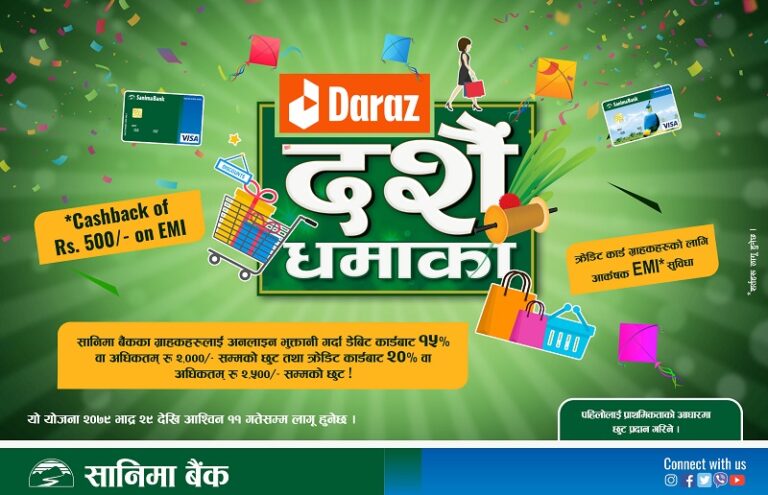 योजना अवधिभर ग्राहकहरुले सानिमा बैंकको डेबिट तथा क्रेडिट कार्डबाट भुक्तानी गर्दा दराजबाट सामान खरिद गर्दा विशेष छुट प्राप्त गर्न सक्नेछन् । यो योजना भाद्र २९ देखि आश्विन ११ गतेसम्म १४ दिनका लागि लागू हुनेछ ।