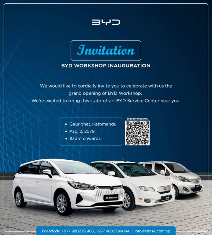 काठमाडौं, ३१ भदौ । विद्युतीय गाडी बिवाइडीले आगामी असोज २ गते काठमाडौंको गौरीघाटमा ‘बिवाइडी वर्कशप’ को उद्घाटन गर्ने भएको छ ।
