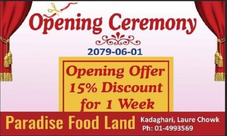 काठमाडौं, ३१ भदौ । नेपाली काँग्रेस रामेछापका युवा नेता तथा सफल व्यवसायी सुर्य बहादुर श्रेष्ठले काडाँघारी लाउरे चोकमा सुबिधा सम्पन्न रेस्टुरेन्ट सञ्चालनमा ल्याएका छन् । उनले पेप्सिकोलादेखि मुलपानी जाने चोकैमा करिब १ करोड २५ लाखको लगानीमा प्याराडाइज फुड ल्यान्ड सञ्चालनमा ल्याएका हुन् ।