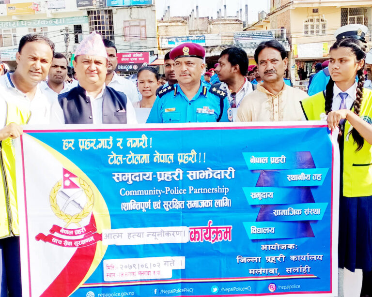 जिल्ला प्रहरी कार्यालय सर्लाहीसँगै, सामुदायिक प्रहरी सेवा केन्द्र, आत्महत्या सम्बन्धी क्षेत्रमा काम गर्ने संघ संस्था, विद्यालय, युवा लगायतको सयुँक्त सहकार्यमा कार्यक्रम सम्पन्न भएको हो । कार्यक्रमलाई सम्बोधन गर्दै जिल्ला प्रशासन कार्यालय सर्लाहीका प्रमुख जिल्ला अधिकरी थानेश्वर गौतमले अमूल्य जीवनलाई खेर फाल्न नहुने बताए ।