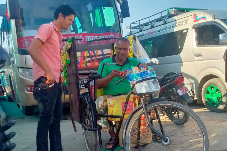 काठमाडौँ,११ असोज । ह्विलचियर खुद्रा सामानले भरिभराउ छ । अगाडिपट्टी पानीका बोतल, नजिकै चाउचाउ, बिस्कुटका कार्टुन राखिएका छन् । ह्विल चियर पछाडि फलाम छोडेर सामान झुण्ड्याउने बनाइएको छ । भीमदत्त नगरपालिका–४ स्थित बसपार्कमा देखिने ह्विल चियरमा सानो कालो झोला भिरेर बसेका भेटिन्छन्– ५० वर्षीय तेजबहादुर रावल ।