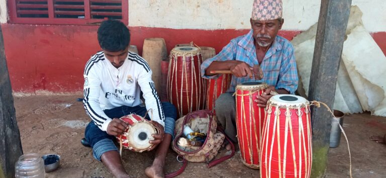 रामपुर (पाल्पा), ११ असोज । सेतै फुलेका कपालमाथि ढाकाटोपी, चिटिक्क परेको सानो घरको पिँढीमा बसेर मादलमा खरी भर्नमै ध्यान तानिएको छ रामबहादुर वादीको । उनी आफ्नै सुरमा बिहान उज्यालो भएदेखि साँझसम्म मादल बनाउनमा व्यस्त छन् ।