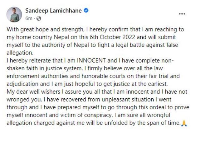 काठमाडौं, असोज १५ । नेपाली क्रिकेटका पूर्वकप्तान सन्दीप लामिछानेले आफू अक्टोबर ६ मा नेपाल आइपुग्ने बताएका छन्।