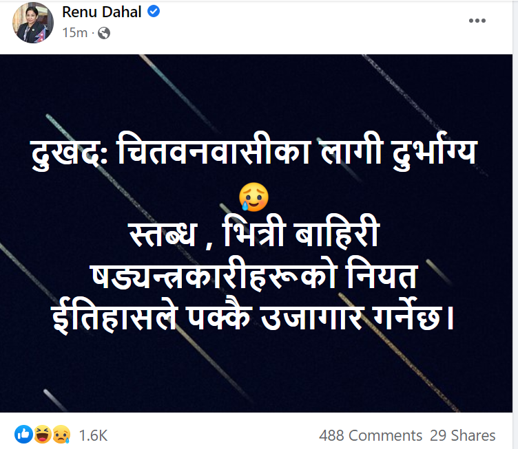 प्रचण्डले चितवन-३ छाडेपछि छोरी रेनु दाहाल स्तब्ध, षड्यन्त्र भएको निश्कर्ष