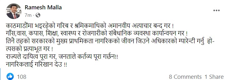 हालै महानगरले काठमाडौंको थापाथलीमा एक महिलाको ठेलागाडा खोसेको थियो । महिलाले भने ठेलागाडा छोड्नै नमानेर धरधरी रोएको तस्विर भाईरल भएको थियो । यही सन्दर्भमा दाहालको सचिवालय सदस्यसमेत रहेका माओवादी नेता मल्लले यस्तो बताएका हुन् । उनले गाँस, वास, कपास, शिक्ष, स्वास्थ्य र रोजगारीको संवैधानिक व्यवस्था कार्यान्वयन गर्न पनि माग गरेका छन् ।