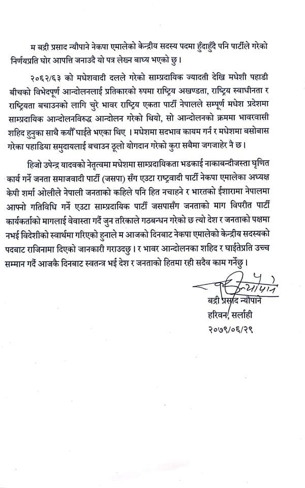 काठमाडौं, २९ असोज । नेकपा (एमाले) का केन्द्रीय सदस्य बद्री न्यौपानेले पार्टी परित्याग गरेका छन् । पछिल्लो समय पार्टीले जसपासँग चुनावी तालमेल गरेपछि न्यौपाने असन्तुष्ट थिए ।