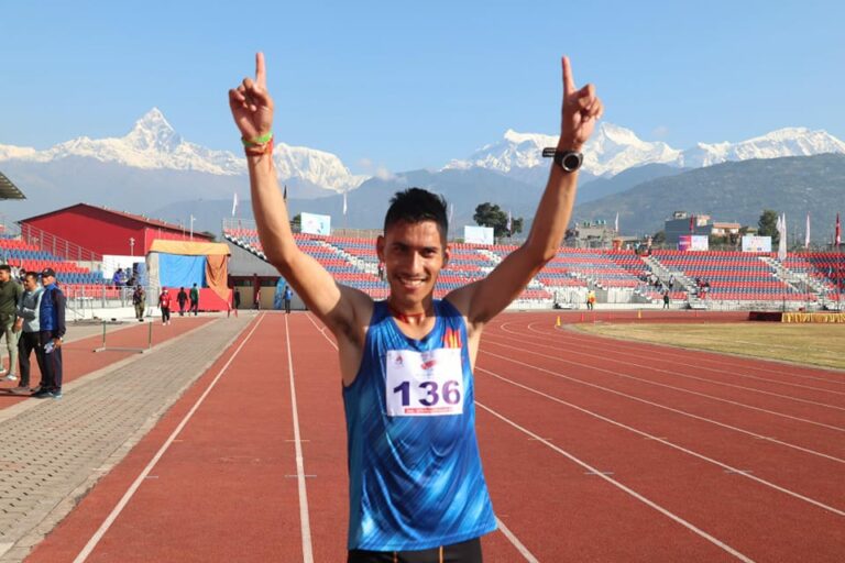 काठमाडौँ,३० असोज । नवौँ राष्ट्रिय खेलकुद प्रतियोगिताअन्तर्गत एथलेटिक्सको पुरुष १० हजार मिटर दौडमा विभागीय टोली त्रिभुवन आर्मी क्लबका दीपक अधिकारीले राष्ट्रिय कीर्तिमानसहित स्वर्ण पदक जितेका छन् ।