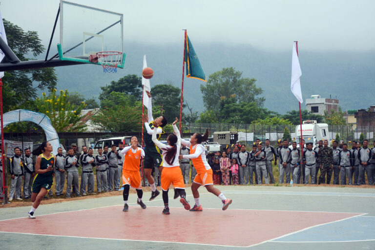 काठमाडौँ,१ कार्तिक । नवौं राष्ट्रिय खेलकुद–२०७९ अन्तर्गत तनहुँको व्यास नगरपालिका–१ निर्मल माविस्थित बास्केटबल कोर्टमा मङ्गलबार आयोजित महिला बास्केटबल प्रतियोगिताको सेमिफाइनलमा प्रतिस्पर्धा गर्दै त्रिभुवन आर्मी क्लब र गण्डकी प्रदेशका खेलाडी । उक्त खेलमा त्रिभुवन आर्मी विजयी भई फाइनलमा प्रवेश गरेको छ । तस्वीर : कृष्ण न्यौपाने/रासस