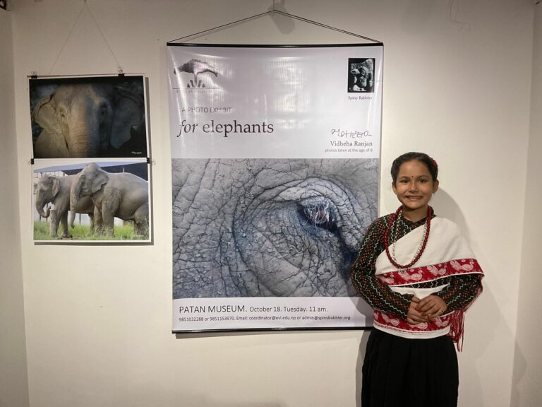 आठ वर्ष पुगेकी विदेहाले स्ट्यान्डअप फोर एलिफन्ट्स र स्पाइनी ब्याबलरसँग मिलेर हात्ती, वातावरण, प्रकृति र जलवायुको प्रभाव देखाउन फोटो प्रदर्शनी गरिएको विदेहाले बताइन् ।