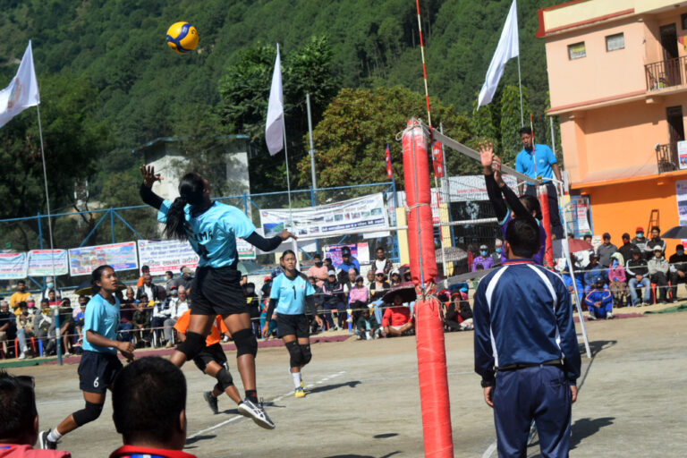 काठमाडौँ,२ कार्तिक । नवौँ राष्ट्रिय खेलकुद प्रतियोगिता अन्तर्गत म्याग्दीको सदरमुकाम बेनीमा जारी राष्ट्रिय महिला भलिबल खेलकुद प्रतियोगितामा तेस्रो स्थानका लागि भएको खेलमा बागमती र गण्डकी प्रदेशबीच प्रतिस्पर्धा हुँदै । गण्डकीलाई पराजित गर्दै बागमती तेस्रो हुन सफल भएको छ । तस्बिर : कमल खत्री/रासस