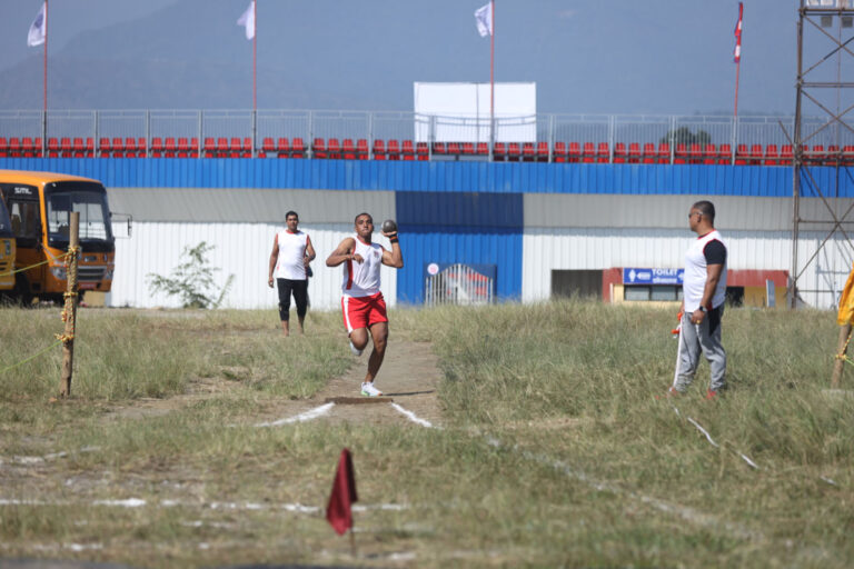 काठमाडौँ,२ कार्तिक । नवौं राष्ट्रिय खेलकूद प्रतियोगिताअन्तर्गत ठेलो हान्ने खेलमा प्रतिस्पर्धा गर्दै खेलाडी । तस्बिर : राधिका कँडेल, रासस