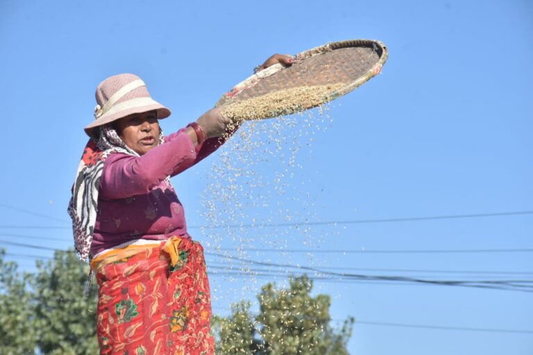 भक्तपुर, ३ कात्तिक । योसिंखेल–५ भक्तपुरमा परम्परागत रुपले धान सुकाएर घरमा भित्राउने तयारी गर्दै किसान । असारमा रोपेको धान भित्राउन अहिले भक्तपुरे किसानलाई भ्याइनभ्याइ छ । शहरीकरण र जग्गा प्लटिङले गर्दा धान उत्पादन घट्दै गएको छ ।