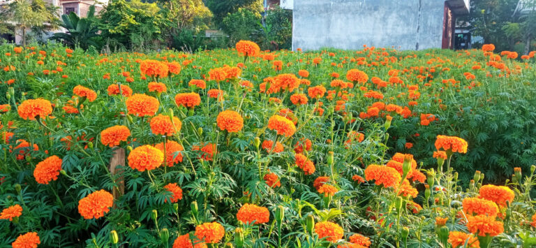 पाल्पा, ५ कार्तिक । पाल्पा रामपुर नगरपालिका ४ स्थित देवीस्थान ढकमक्क फूल्दै गरेको सयपत्री फूल । यहाँ तिहार लक्षित व्यावसायिक रुपमा सयपत्री फूल खेती गरिएको छ । तस्बिर : सुशीला रेग्मी/रासस
