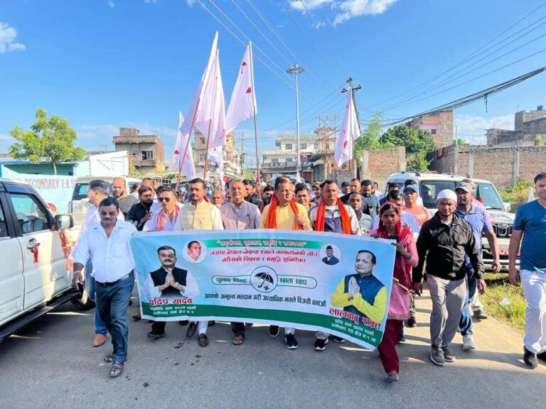 वीरगञ्ज, ६ कार्तिक । पर्सा निर्वाचन क्षेत्र नम्बर १ बाट प्रतिनिधिसभा सदस्य पदका उम्मेदवार प्रदीप यादवले आज सातौँ दिन पनि चुनावी रोड शो र जनता भेटघाट कार्यक्रमलाई निरन्तरता दिएका छन् । पूर्वमन्त्रीसमेत रहेका यादवले आइतबार क्षेत्र नम्बर १ मा पर्ने वीरगञ्ज महानगरपालिकाको वडा नम्बर १५ स्थित भुषुवा र वडा नम्बर १६ स्थित नगवामा रोड शो गरेका हुन् ।
