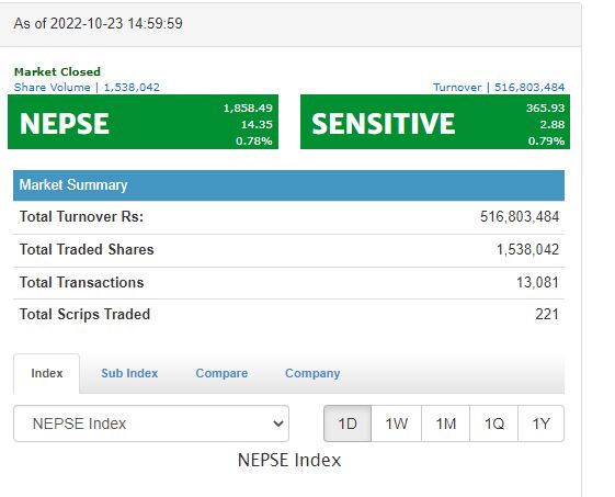 काठमाडौं, ६ कात्तिक । साताको कारोबारको पहिलो दिन शेयर बजारमा आज दोहोरो अंकको वृद्धि भएको छ । नेप्से परिसुचक १४ दशमलव ३५ अंकले बढेर १८५८ दशमलव ४९ बिन्दु कायम भएको हो ।