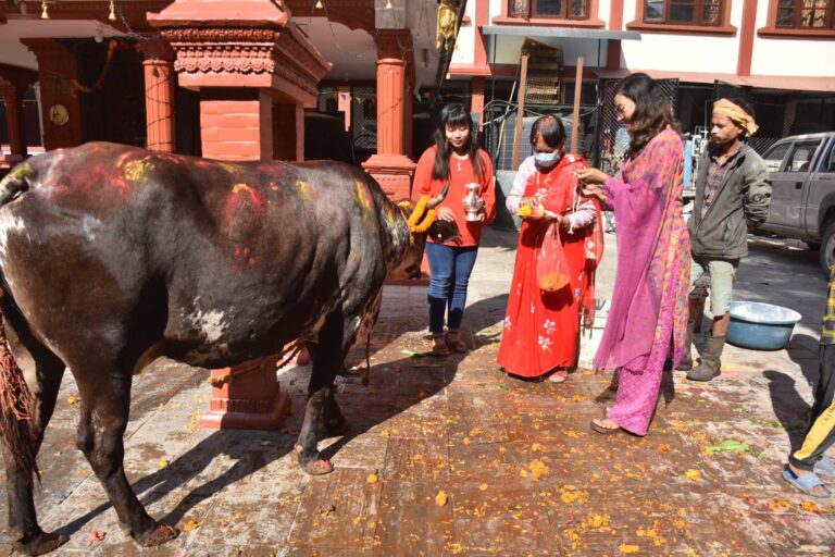 घरमा गाई नभएकाले पशुपतिको गौशालामा गएर गाई पूजा गर्ने प्रचलन रहेको छ । Photo : Mukunda Kalikote