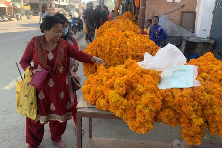 ललितपुरको इमाडोलमा सयपत्री फूलको माला किन्दै सर्वसाधारण । तस्बिर : चन्द्रकला क्षेत्री/रासस