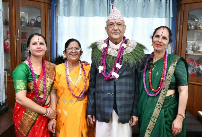 अध्यक्ष ओलीले बालकोटस्थित आफ्नै निवासमा विष्णुमाया ढकाल, कौशिल्या कोइराला र कान्छी बहिनी विष्णु ओलीद्वारा भाइटीका ग्रहण गरेको उनको सचिवालयले जनाएको छ ।