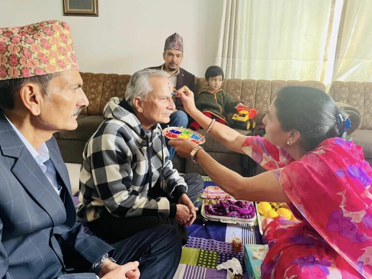 टीका ग्रहणको तस्विर सामाजिक सञ्जालमार्फत सार्वजनिक गर्दै उनले लेखेका छन्-“संयुक्त परिवारमा उल्लासमय भाइटीका!बहिनी पार्वती भट्टराईबाट मैले र भाइले टीकाग्रहण! मानुषी,प्रेरणा र अस्मिताद्वारा दाज्यु र भाइहरू प्रेरित,अनुप र संकल्पलाई भाइटीका !”