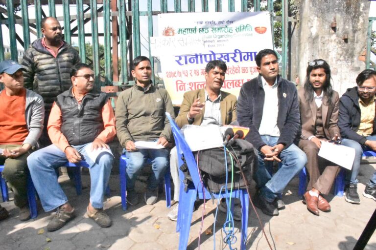 आज (शनिबार) छठ समारोह समितिले रानीपोखरी परिसरमै पत्रकार सम्मेलन गरेर यस्तो माग गरेको हो । समितिले गत असोज ७ गते छठ पर्व मनाउनका लागि सो स्थान उपलब्ध गराउन प्रधानमन्त्रीको कार्यालय, संस्कृति मन्त्रालय, गृह मन्त्रालय, काठमाडौं महानगर र मधेशी आयोगलाई निवेदन दिईएको जनाएको छ ।