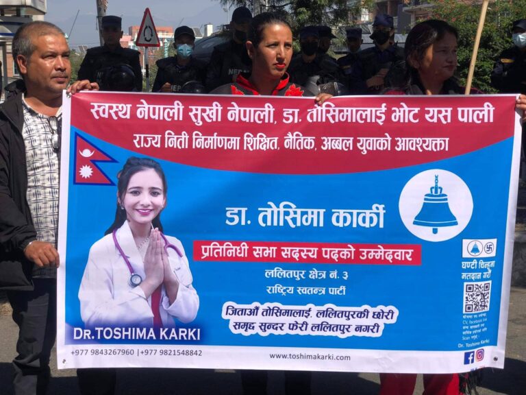काठमाडौं, १४ कात्तिक । आसन्न मंसिरमा हुने निर्वाचनका लागि ललितपुर–३ बाट प्रतिनिधि सभा सदस्यको उम्मेदवार रहेकी डा.तोसिमा कार्कीका समर्थक विरोधमा उत्रिएका छन् । राष्ट्रिय स्वतन्त्र पार्टीबाट उम्मेदवार बनेकी कार्कीका समर्थकले निर्वाचन आयोगले गरेको उनको उम्मेदवारी खारेजीको निर्णयका विरुद्ध आज माइतीघर मण्डलामा विरोध र्याली निकालेका हुन् ।