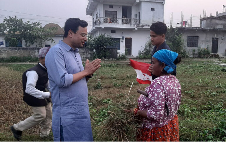 काठमाडौँ,१७ कार्तिक । कैलाली क्षेत्र नं ५ ‘ख’ का प्रदेशसभा सदस्यका उम्मेदवार प्रकाशबहादुर देउवा बिहीबार धनगढी उपमहानगरपालिका– २ कालिका टोलस्थित खेतमा काम गरिरहेकी महिलासँग भोट माग्दै । आगामी मङ्सिर ४ गते हुने निर्वाचनका लागि उम्मेदवारहरु घरदैलो अभियानमा व्यस्त छन् । तस्बिर : तिलकराज ओझा/रासस