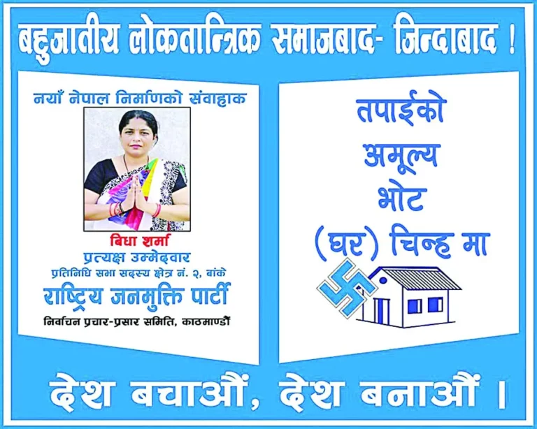 ‘घर’ चुनाव चिह्न र ‘देश बचाऔं, देश बनाऔं’ नारा रहेको उक्त पार्टीले ‘नयाँ नेपाल निर्माणको संवाहक’ विद्या शर्मा लेखिएको पर्चा समेत बनाइसकेको छ । तर, सरकारी कागजात किर्ते गरेको आरोपमा अदालतले पुर्पक्षका लागि थुनामा पठाएको शर्माले जेलभित्रबाटै चुनाव लड्नुपर्ने देखिएको छ ।