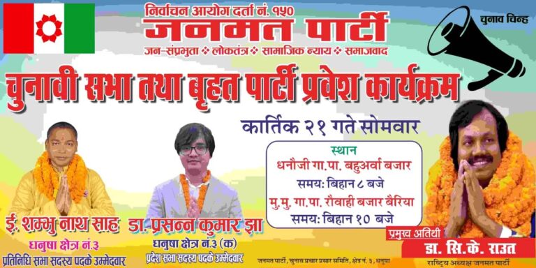 काठमाडौं, २० कार्तिक । जनमत पार्टीले आगामी मंसिर ४ गते हुने निर्वाचनको लागि व्यापक चुनावी प्रचार थालेको छ । आफ्ना उम्मेदवार जिताउनको लागि अध्यक्ष डा. सिके राउत नै फिल्डमा खटिएका छन् ।