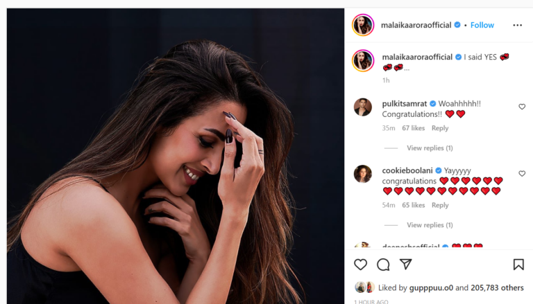 हालै मलाइकाले सामाजिक सञ्जालमा आफ्नो एउटा तस्बिर सेयर गरेपछि फ्यानले यो जोडी इन्गेजमेन्ट गरेको अनुमान गरेका छन् । मलाइकाको यो पोस्टमा फ्यान र नजिकका साथीहरुले उनलाई हार्दिक बधाई दिइरहेका छन् ।