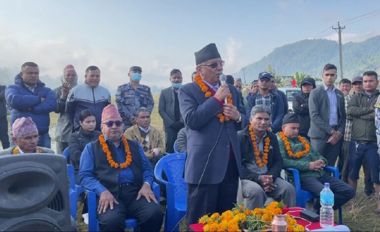 काठमाडौं, २६ कार्तिक । नेकपा (माओवादी केन्द्र) का अध्यक्ष तथा गोरखा क्षेत्र नं २ का प्रतिनिधिसभा सदस्य पदका उमेदवार पुष्पकमल दाहाल ‘प्रचण्ड’ले हसियाँ हथौडा र रुखबीच सम्झौता भएर नै देशमा गणतन्त्र र नयाँ सविधान सम्भव भएको बताएका छन् । चुनाव प्रचार–प्रसारका लागि गोरखामा रहेका उनी पालुङटार नगरपालिकामा आज (शनिबार) बिहान आयोजित कार्यक्रमलाई सम्बोधन गर्दै अब रुखले हसियाँ हथौडा र हसियाँ हथौडाले रुखमा मतदान गर्न हिच्किचाउन नपर्ने बताएका छन् ।