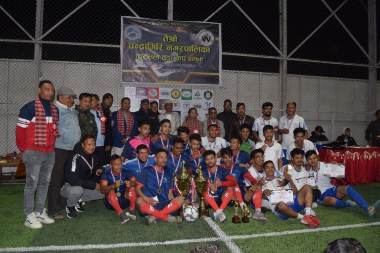 काठमाडौँ,२७ कार्तिक । ‘चन्द्रागिरि नगरपालिका वडास्तरीय फुटसल प्रतियोगिता २०७९’ को उपाधि चन्द्रागिरी–१५ ले चुमेको छ । नगरपालिकाको सर्वाधिक राशिको तेस्रो संस्करणको सो प्रतिप्रतियोगितामा उसले वडा नं ९ लाई एकका विरुद्ध पाँच गोल गर्दै रु ८० हजारसहित ट्रफी र पदक चुुमेको छ भने वडा ९ दोस्रो भई रु ४० हजारसहित ट्रफी र पदक हात पारेको छ ।