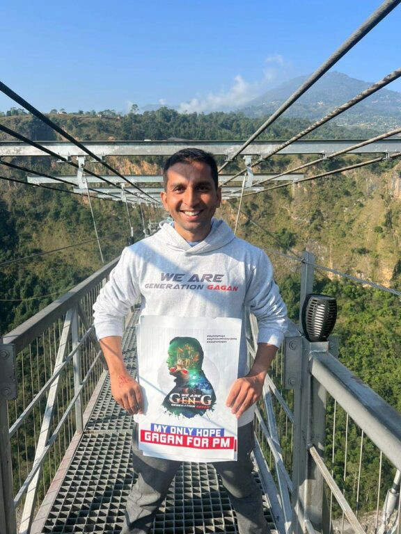 विश्वको दोस्रो अग्लो बन्जीबाट बाग्लुङ – ४ नारायणस्थानका ३५ वर्षीय सुमन शर्माले ‘भोट फर गगन थापा’ भन्दै हातमा प्लेटकार्ड बोकेर हाम फालेका हुन् । कालीगण्डकी नदीमाथि दुई सय २८ मिटर उचाइबाट हाम फालेको कार्यक्रमका संयोजनकर्ता पवन आचार्यले जानकारी दिए ।
