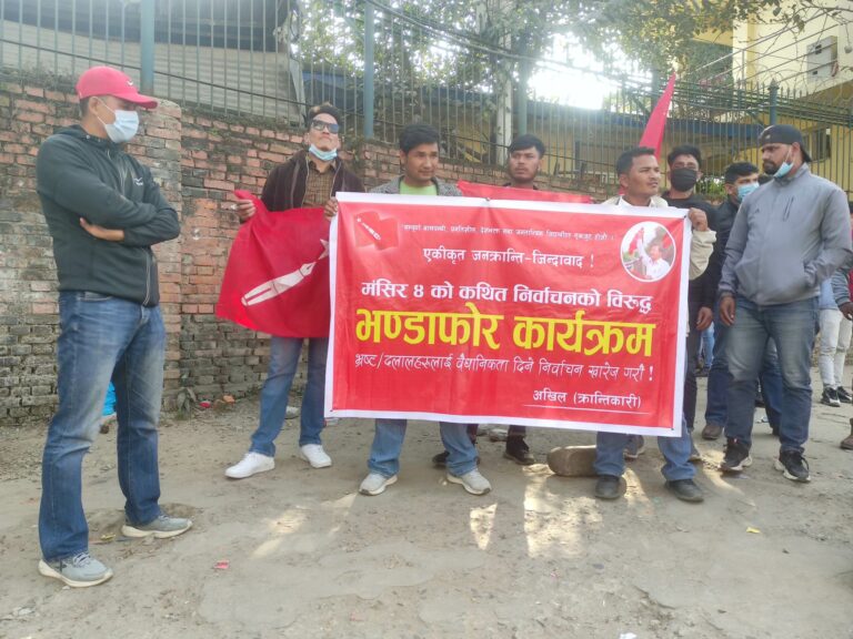 प्रतिनिधि सभा तथा प्रदेश सभा निर्वाचनलाई क्रान्तिकारीले ‘कथित निर्वाचन’को संज्ञा दिँदै ‘भ्रष्ट/दलालहरुलाई वैधानिकता दिने निर्वाचन खारेजी गरौं ।’ भन्ने नारा अखिलले अघि सारेको छ । अखिल क्रान्तिकारीले काठमाडौंको रत्नपार्क, बानेश्वर, माइतीघरलगायत मुख्य स्थानहरुमा निर्वाचनविरुद्ध भण्डाफोर कार्यक्रम आयोजना गर्ने भएको छ। Photo : Mukunda Kalikote