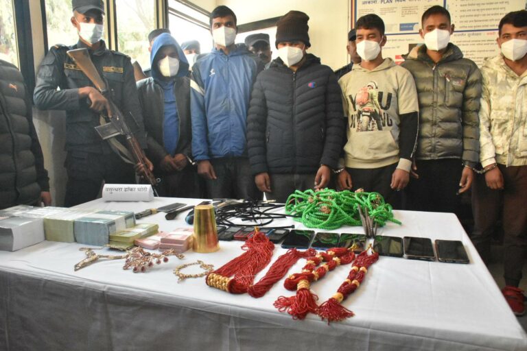काठमाडौं, ८ मंसिर । नेपाल प्रहरीले सुन, नगद र हिराका बहुमूल्य गरगहना लुटपाट गरी फरार गिरोहलाई पक्राउ गरेको छ । जिल्ला प्रहरी परिसर काठमाडौँ र प्रहरी वृत्त महाराजगञ्जको टोलीले काठमाडौँ महानगरपालिका वडा नं ३ वसुन्धरास्थित मधुरविक्रम खनालको घरमा प्रवेश गरी सुन, नगद र हिराका बहुमूल्य गरगहना लुटपाट गरी फरार १० जनालाई पक्राउ गरी आज सार्वजनिक गरेको हो ।