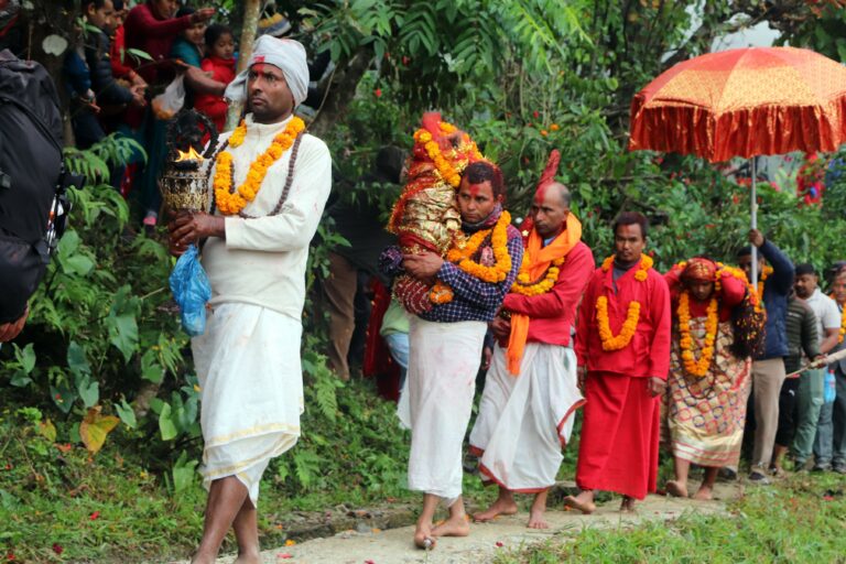 मलेखु, ११ मङ्सिर । अघिअघि पञ्चेबाजासँगै नाङ्गो खुँडा, खुकुरी बोकेका युवा । त्यसपछि दियो, कलश, शङ्ख, घण्टसहितका नरनारी, प्रहरी र भक्तजनले बनाएको हाते साङ्लोको घेराभित्र लामो कपाल मात्र देखिने प्रतिमूर्ति । सयौँ मानिस बाटोको दायाँबायाँ बसेर पूजापाठ र अबीर जात्रा गर्दै थिए । धादिङको त्रिपुरासुन्दरी गाउँपालिकाको वडा नं ४ सल्यानकोटबाट त्रिपुरा सुन्दरी भगवतीको प्रतिमूर्तिलाई त्रिपुरासुन्दरी गाउँपालिकाकै वडा नं ६ हाँसेबजारस्थित माइथानबेंसी सारिदाको यसरि तामझामसित सारिन्छ ।