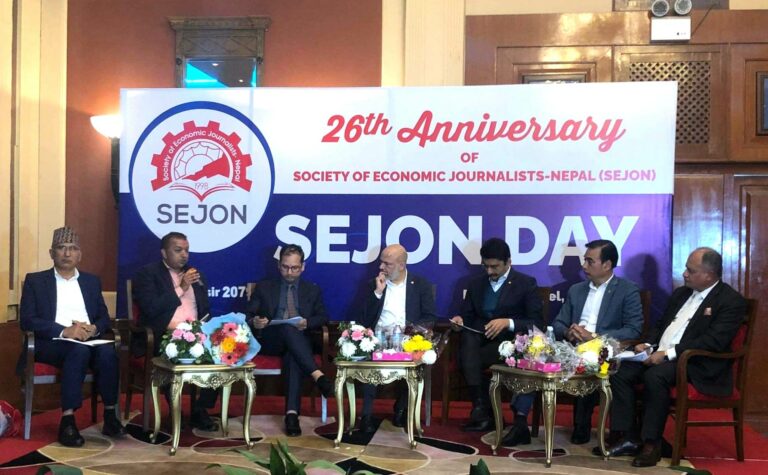 काठमाडौं, १५ मंसिर । नेपाली कांग्रेसका महामन्त्री गगनकुमार थापाले देशको विकासको लागि सरकार र निजी क्षेत्रले सहकार्य गर्नुपर्ने खाँचो औंल्याएका छन् । आज (बिहीबार) आर्थिक पत्रकार समाज (सेजन) को २६औं वार्षिकोत्सवमा बोल्दै उनले यस्तो बताएका हुन् । उनले अब बन्ने सरकारले देशको अर्थतन्त्रलाई चलायमान बनाउनुपर्नेमा जोड दिए । पछिल्लो समय देशको पैसा बाँड्ने कुरामा दलहरुबीच प्रतिष्पर्धा नै भैरहेको छ ।