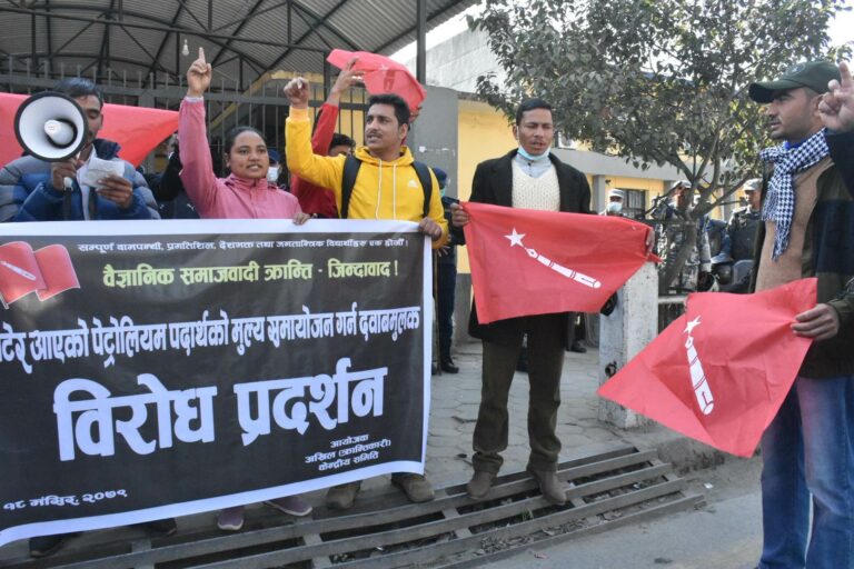 अखिल क्रान्तिकारीले आइतबार निगमको कार्यालय टेकुमा घटेर आएको पेट्रोलियम पद्धार्थको मुल्य समायोजन गर्न दबाब दिँदै विरोध प्रदर्शन गरेको हो ।