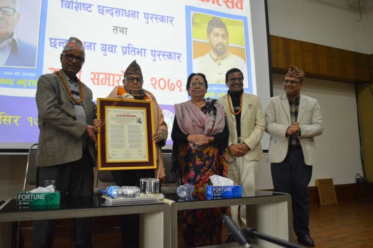 काठमाडौँमा आयोजित एक विशेष समारोहमा प्रमुख अतिथि वरिष्ठ भाषाविद् प्रा.डा. माधव पोखरेलले वरिष्ठ कवि रामचन्द्र भट्टराईलाई ‘विशिष्ट छन्दसाधना पुरस्कार–२०७९’ र युवाकवि सुदेश सत्याललाई ‘छन्दसाधना युवा प्रतिभा पुरस्कार–२०७९’ बाट पुरस्कृत गरेका हुन् ।