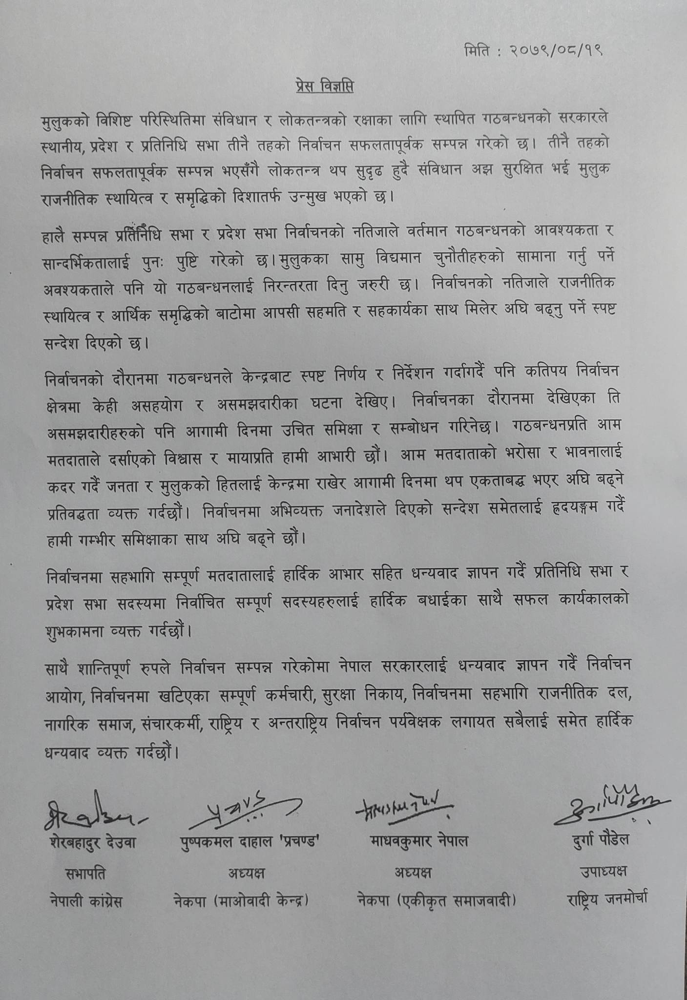 गठबन्धनप्रति आम मतदाताले दर्शाएको विश्वास र मायाप्रति आभार व्यक्त गर्दै बैठकले आम मतदाताको भरोसा र भावनालाई कदर गर्दै जनता र मुलुकको हितलाई केन्द्रमा राखेर आगामी दिनमा थप एकताबद्ध भएर अघि बढ्ने प्रतिबद्धता व्यक्त गरेको छ । निर्वाचनमा अभिव्यक्त जनादेशले दिएको सन्देश समेतलाई हृदयङ्गम गर्दै गम्भीर समीक्षाका साथ अघि बढ्ने प्रधानमन्त्री एवं नेपाली कांग्रेसका सभापति शेरबहादुर देउवा, नेकपा (माओवादी केन्द्र)का अध्यक्ष पुष्पकमल दाहाल ‘प्रचण्ड’, नेकपा (एकीकृत समाजवादी)का अध्यक्ष माधवकुमार नेपाल र राष्ट्रिय जनमोर्चाका दुर्गा पौडेलद्वारा जारी विज्ञप्तिमा उल्लेख छ ।