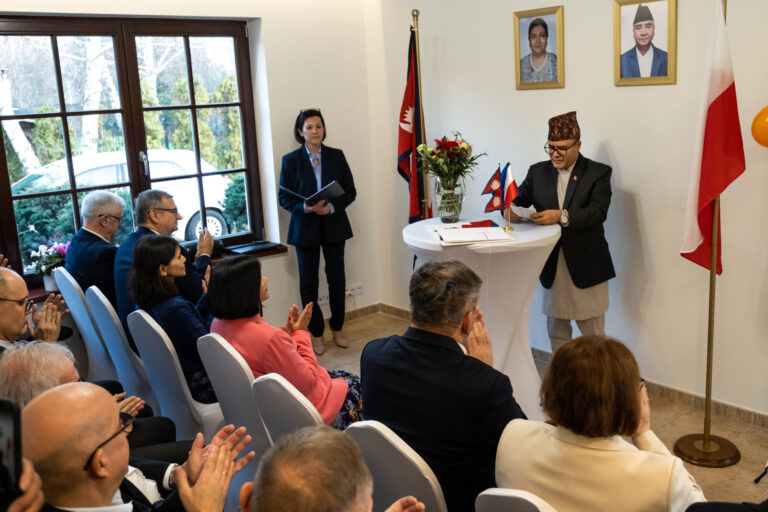 काठमाडौँ,२६ मँसिर । जर्मनीका लागि नेपाली राजदूत रामकाजी खड्काले शुक्रबार पोल्यान्डको राजधानी वार्सामा कन्सुलर अफिसको उद्घाटनपश्चात् सम्बोधन गर्दै । नेपाल सरकारद्वारा हालै पोल्यान्डका लागि अवैतनिक वाणिज्यदूत नियुक्त गरिएका डा। बोधराज सुवेदीको पहलमा उक्त अफिस स्थापना गरिएको हो । करिब ६३ वर्ष लामो कूटनैतिक, राजनीतिक र सांस्कृतिक सम्बन्ध रहेको पोल्यान्डमा नेपालको इतिहासमा पहिलोपटक नेपालतर्फबाट अवैतनिक वाणिज्यदूत नियुक्त गरिएको हो । तस्बिर ः कृष्णप्रसाद शर्मा÷रासस