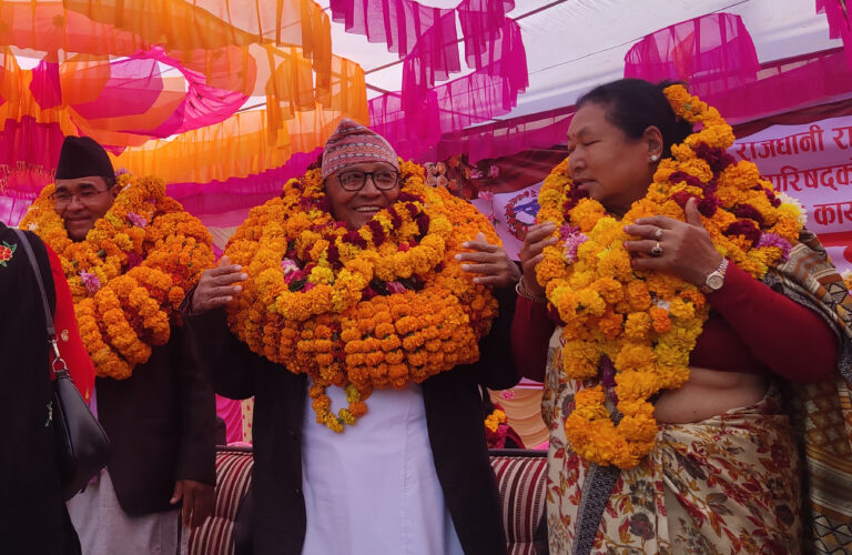 काठमाडौँ,२८ मँसिर । लुम्बिनी प्रदेशको राजधानी राप्ती उपत्यका (देउखुरी)दाङमा मुख्यमन्त्री कार्यालय उद्घाटन कार्यक्रममा प्रदेश प्रमुख अमिक शेरचन, मुख्यमन्त्री कुलप्रसाद केसीलाई स्थानीयवासीले लगाइदिएको बीस/बीस किलोको माला । तस्बिरःसनिउल्ला धोबी/रासस