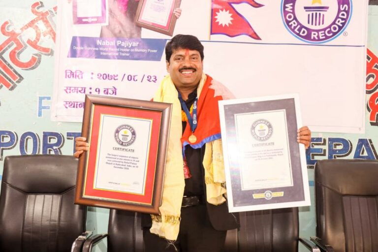 काठमाडौं, १ पुष । एक मिनेटमा ५९ शब्दलाई स्मरण गरेर डा.नवल पजियारले दोस्रो विश्व किर्तीमानि राखेका छन्। यसअघि उनले २०२० मा एक मिनेटमा ५४ वटा वस्तुलाई स्मरण गरेर गिनिज बुक अफ द वर्ल्ड रेकर्डस्मा नाम लेखाएका थिए ।