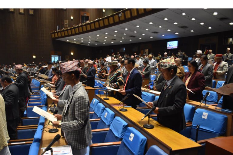 यसअघि प्रतिनिधिसभाका ज्येष्ठ सदस्य पशुपतिशम्शेर जबराले नवनिर्वाचित सांसदहरूलाई पद तथा गोपनीयताको शपथ गराएका थिए । नेपालको संविधानको धारा ८८ बमोजिम सङ्घीय संसद्को प्रत्येक सदनका सदस्यले सदन वा त्यसको कुनै समितिको बैठकमा पहिलोपटक भाग लिनुअघि सङ्घीय कानुनबमोजिम शपथ लिनुपर्ने व्यवस्था छ ।
