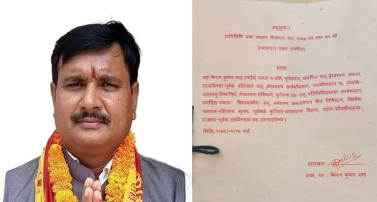 काठमाडौं, पुस ८ । नेपालको संसदीय इतिहासमा पहिलोपटक विश्वकै पुरानो भाषा संस्कृतमा शपथ लिइएको छ । बज्जिका मातृभाषा बोल्ने स्वतन्त्र सांसद किरणकुमार साहले बिहीबार गेरुवा वस्त्रमा संस्कृत भाषामा शपथ लिएसँगै यसको चर्चा सुरु भएको छ ।